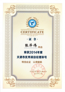 天津市(shì)優秀項目經理(lǐ)稱号—張澤偉(201Ω®β4年(nián)度)