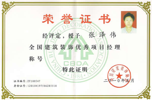 全國(guó)優秀項目經理(lǐ)-張澤偉(2010年(nián)度)↓♦
