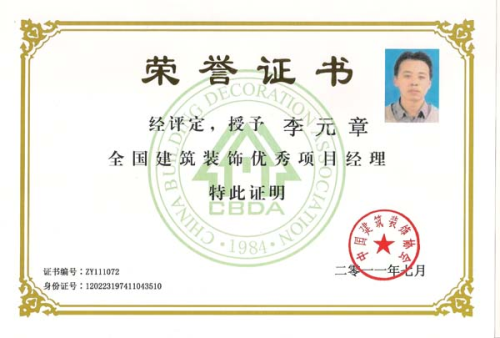 全國(guó)優秀項目經理(lǐ)-李元章(zhāng)(2±₽↕011年(nián)度)