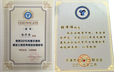 天津市(shì)建設工(gōng)程優秀♦↑項目經理(lǐ)-張澤偉(2015年(nián)度)