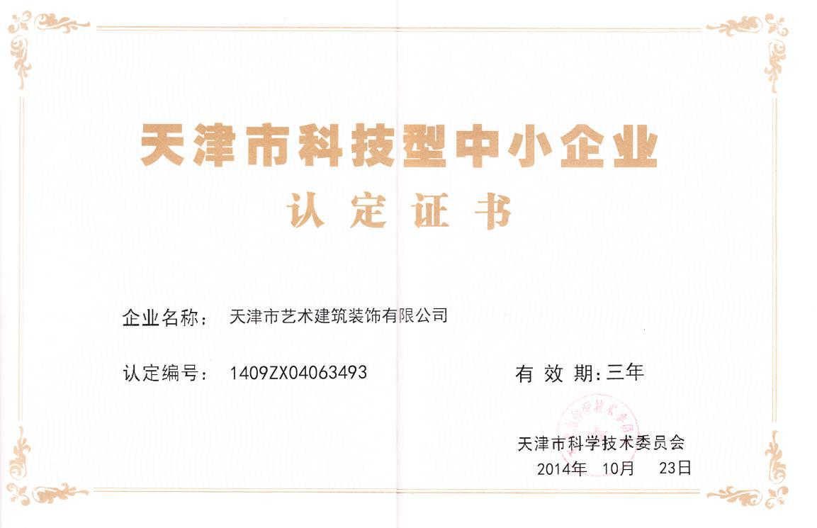 圖 天∞λ津藝裝榮獲“天津市(shì)科(kē)技(jì✔Ωφ)型中小(xiǎo)企業(yè)”認定證書(shū)