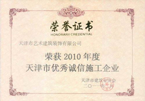 優秀誠信施工(gōng)企業(yè)(2010年(niá×δαn)度證書(shū))